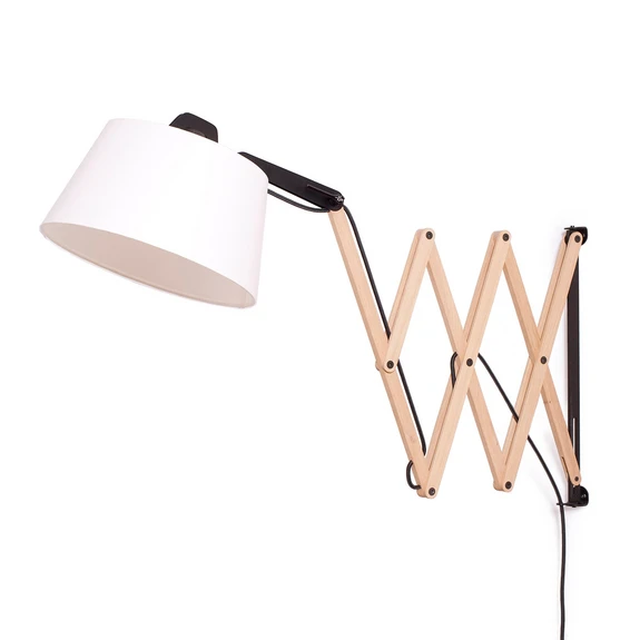 Edward wall light with extendable scissor arm, plug and dimmable Flexibility is the top priority with Edward. Thanks to the scissor arm and the articulated suspension of the lampshade, the direction can be adjusted. The supply cable is fitted with a plug and has an integrated manual dimmer that allows the light output to be controlled. The high-quality scissor construction is made of white oak elements that are connected to each other with steel screws. The chintz lampshade has a classic, slightly conical cylindrical shape. Thanks to the adjustable shade direction and brightness, Edward is a versatile wall light for living rooms and public areas.