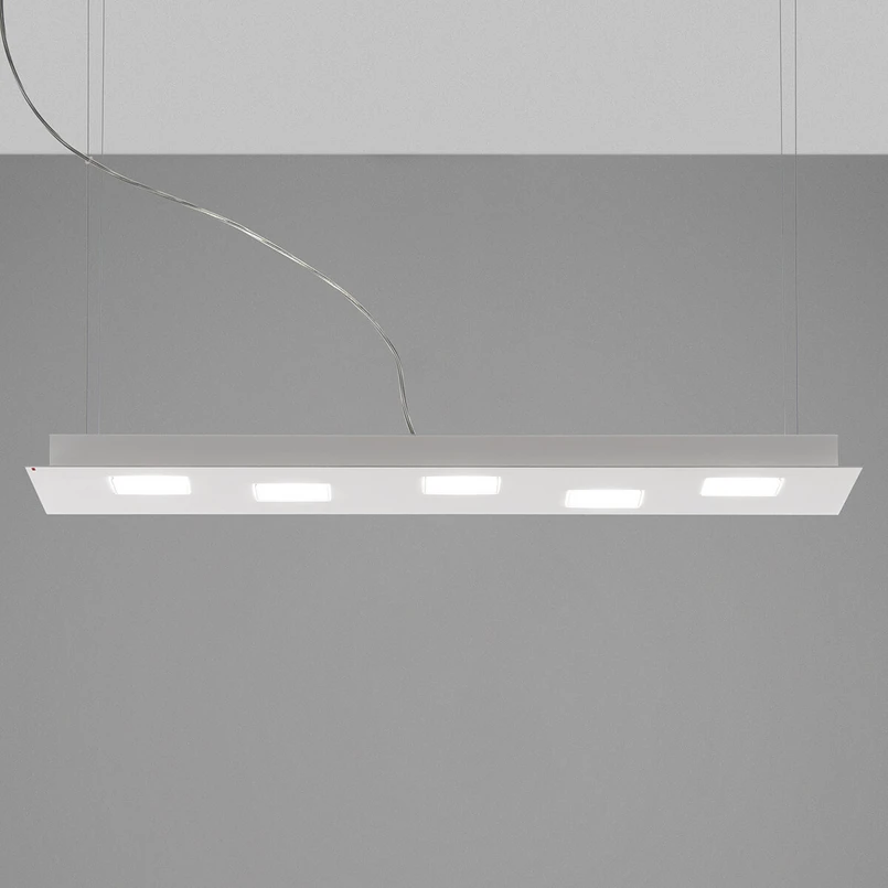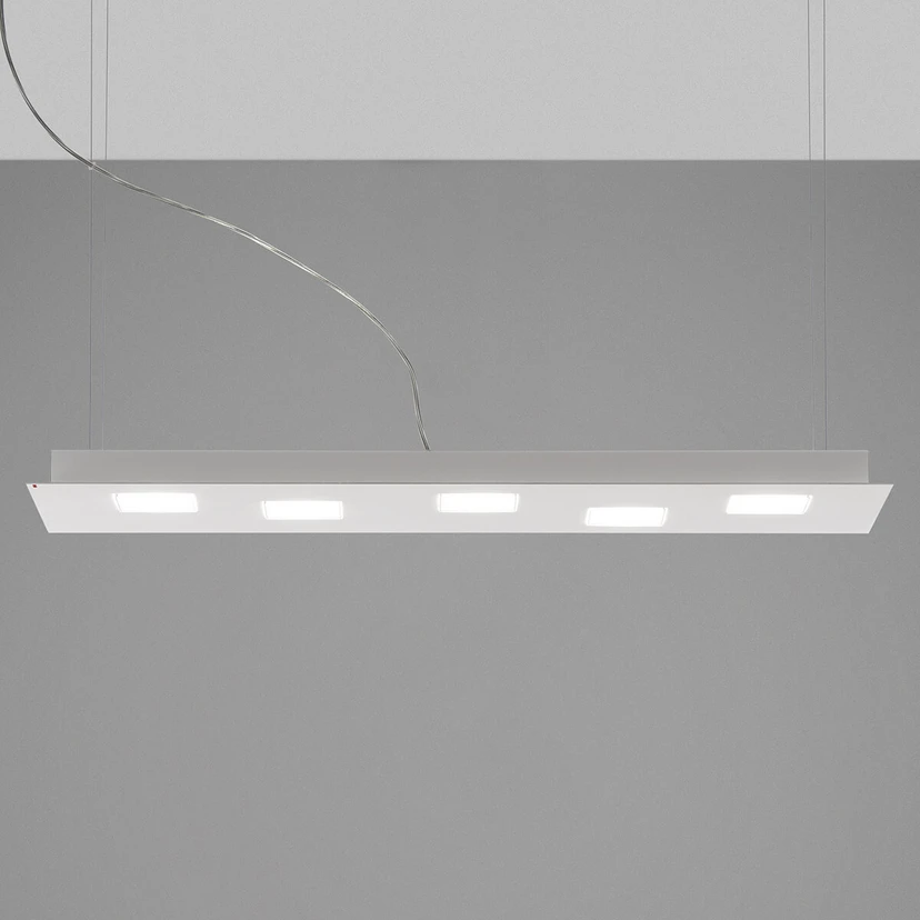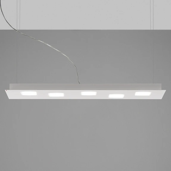 LED hanging lamp Quarter shining upwards and downwardsPerfectly fitting above a dining table or even a conference table is the LED hanging lamp Quarter, in whose aluminium body there are five square recesses made of polycarbonate, through which the light of the LEDs falls downwards. It also emits light upwards and thus creates pleasant indirect light. The LEDs can be dimmed (Triac), but a dimmer is not included. Quarter is a luminaire from Fabbian, an Italian luminaire manufacturer that has made a name for itself worldwide with its high-quality products.