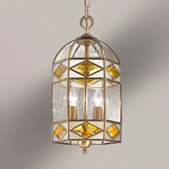 Emilia hanging light is an enchanting decorative piece for adding ambience to your living space. The beautiful lampshade is attached to a rustic chain suspension and is equipped with two brown candelabra lights for candle bulbs. The lampshade is made of textured glass. To this end, a metal frame with a brown finish forms its housing in a lantern shape with a round arch. The frame's structure is filled with elegant transparent glass. The look of the light is complemented by yellow glass inserts made of diamond-shaped cathedral glass. This creates a charming glass look and enriches the living room with a nostalgically beautiful lighting design. Candle bulbs work especially well for elegant evening illumination and produce fascinating lighting effects in the coloured glass. Emilia makes for beautiful additional lighting in larger living rooms or can light up smaller rooms as the main light. It can also be used in a hallway or foyer as well as in a winter garden. Its charming exterior creates a pleasant atmosphere. The light comes from Italy where it is made by hand.