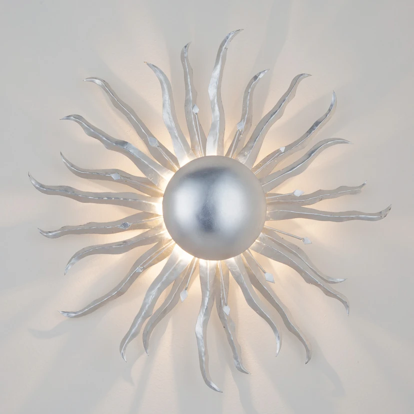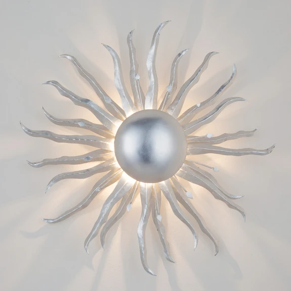 Wall/ceiling lamp SONNE SILVER - a stunning eye-catcher in any roomWarmth and light, a great human longing, come to life in the wall/ceiling lamp SONNE. The luminaire creates effective shadow plays, which result from the refraction of the hand-forged sun rays. The SONNE luminaire can be used both as a wall luminaire and as a ceiling luminaire. A particularly striking, unique luminaire for tasteful, indirect lighting. Available in different versions.