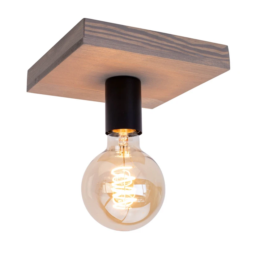 Sustainably manufactured Lobo ceiling light with a minimalist design Lobo is a ceiling lamp that doesn't need a lampshade at all. Instead, the focus is on the bulb itself, which is why the use of so-called Globe bulbs is recommended (see accessories). The square ceiling plate is made of grey-stained pine wood and provides natural accents. The socket, into which the Globe bulb is inserted, is located in the centre of the ceiling plate and is encased in a black finish. Envostar is a brand that produces lights in an ecologically sustainable way. All lights are "Made in Europe" and have short transport routes, which has a positive impact on CO2 emissions. Envostar also favours sustainability in its choice of materials, as the wood used for the ceiling light comes from sustainably managed forests. The packaging materials are also 100% plastic-free.