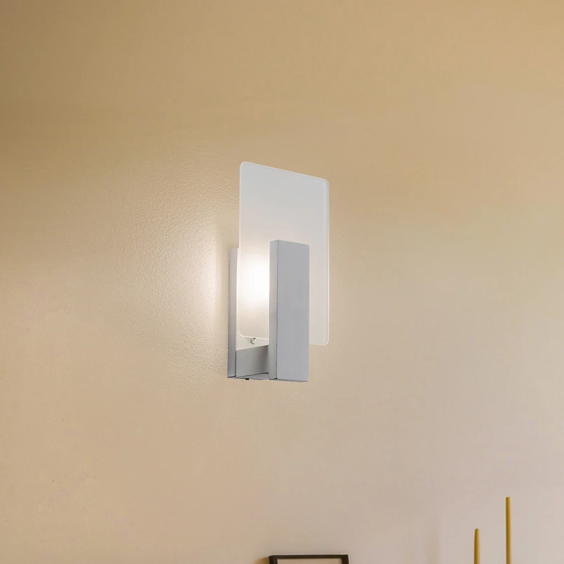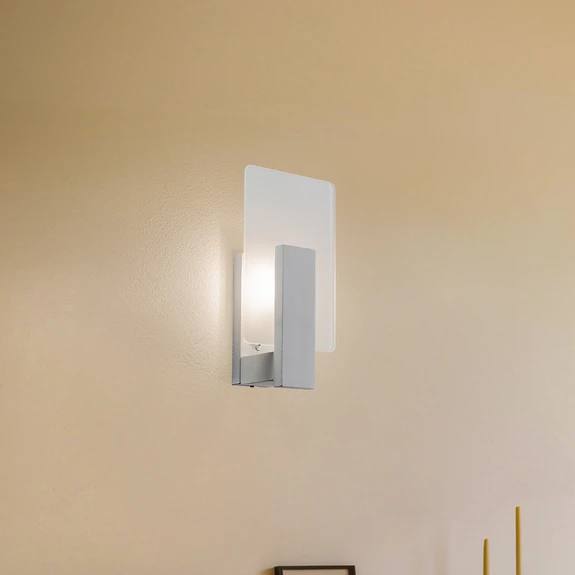 Rectangular Peach Puff wall light with white wooden holder and glass diffuser The modern Peach Puff wall light from European production impresses with its soft lighting effect, which is achieved thanks to the flat disc made of frosted glass and the indirect light emission via the wall. The white body is made of wood. There is space behind the glass element for a light source with a maximum diameter of 4.5 cm / length of 8.9 cm.