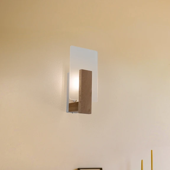 Rectangular Peach Puff wall light with natural wooden holder and glass diffuser The modern Peach Puff wall light from European production impresses with its soft lighting effect, which is achieved thanks to the flat disc made of satinised glass and the indirect light emission via the wall. The body is made of light-coloured wood. There is space behind the glass element for a light source with a maximum diameter of 4.5 cm / length of 8.9 cm.