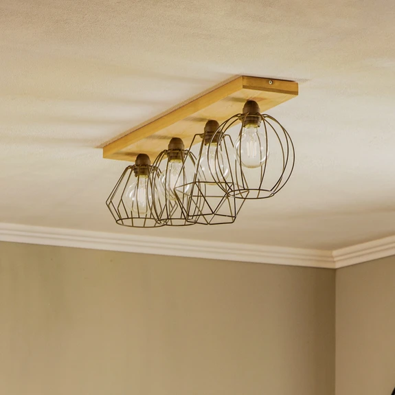 Four-light Various ceiling light with canopy made of light-coloured pine wood and black cage shades The Various ceiling light has a creative and modern look with its four cage shades made of metal struts, each of which is individually shaped and can be perfectly fitted with decorative filament lamps. The shades are mounted below a rectangular canopy, which is made of light-stained pine wood, giving the luminaire a warm and natural touch. Sustainability is the focus of the Envostar brand. Production at sites in Europe reduces transport routes and CO2 emissions, and the packaging is made from recyclable materials.