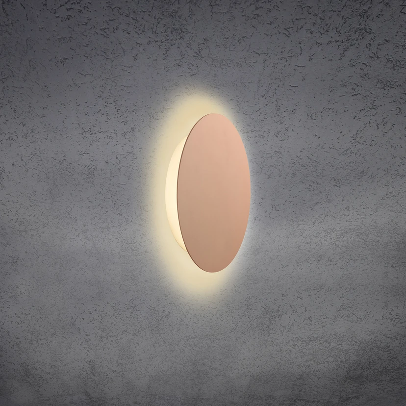 In matt rose - indirect LED wall light Blade The Blade wall light from the manufacturer Escale enriches modern interiors as a pleasant light source. This is achieved by arranging the LEDs on the back, resulting in indirect light emission. The entire front is taken up by a circular disc made of aluminium with an anodised matt rose finish. Only through a narrow gap to the wall does the warm white light penetrate outwards all around, creating a diffuse CORONA in the wall section around the light - externally Triac dimmable - alternative connection via plug cable possible (see accessories) - can also be used as a ceiling light