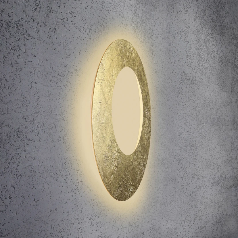 With the LED wall lamp Blade Open, the manufacturer Escale offers a light source for modern interiors, which at the same time looks luminous, pleasant and noble. Blade Open consists of a flat, circular aluminum plate in beguiling gold leaf, which has a slightly eccentrically placed circular opening. Through this, as well as all around the luminaire, the brightly illuminated wall can be seen, which reflects the warm white light of the LEDs integrated on the back into the room.