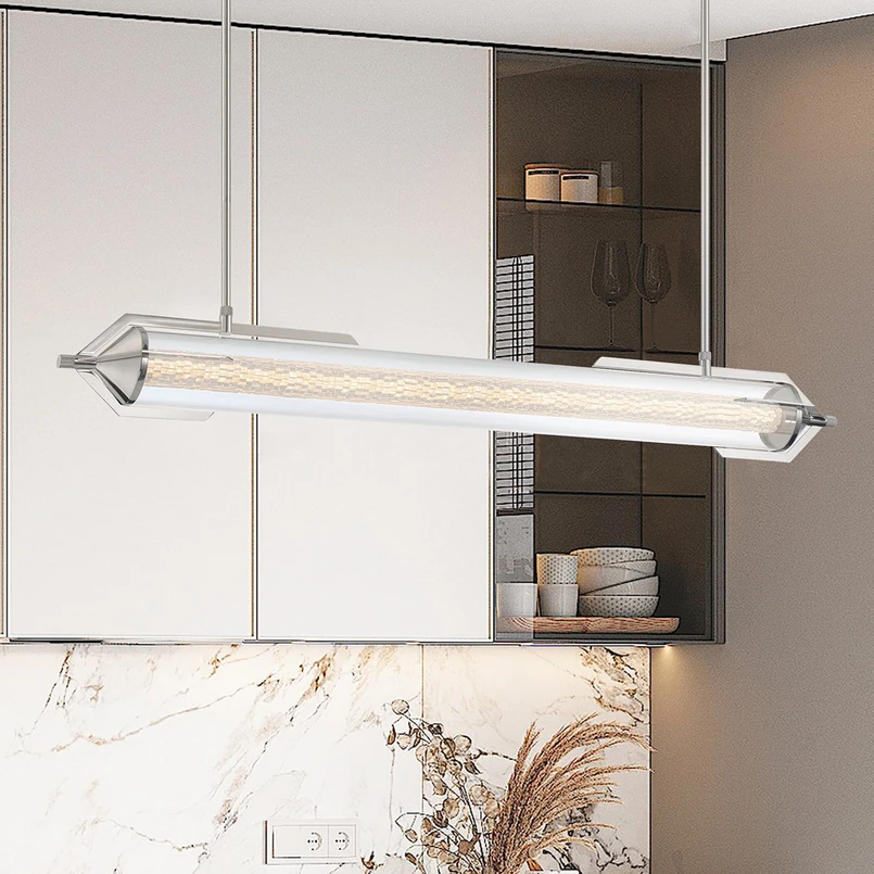 The ESPADA LED pendant light combines modern design with functional lighting. Made from aluminium, glass and steel, it impresses with its high-quality workmanship and elegant combination of polished chrome and clear glass. With a warm white light colour of 3,000 K and excellent colour rendering of 95 Ra, it creates a pleasant and natural lighting atmosphere. The integrated LED light source guarantees an energy-efficient and long-lasting lighting solution.