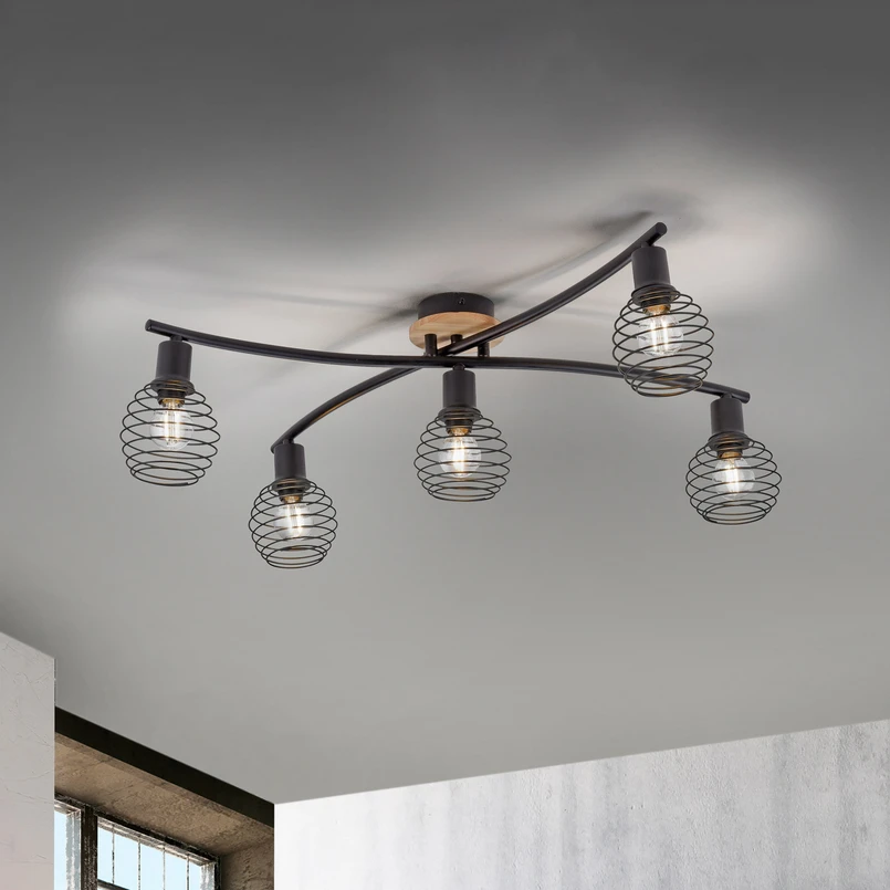 Ceiling lamp Eugen is a striking eye-catcher in the room due to its sweeping shape and color contrast. The cage-like shades reveal the view of the inserted illuminants. Therefore, it is recommended to use decorative filament light bulbs for further enhancing the look, as they are available via the accessories. The wooden decor adds natural flair to the Eugen ceiling lamp.