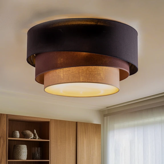 The Euluna Trio Max ceiling light impresses with its harmonious colour composition in black, earth brown and cappuccino. Made from a combination of textile, foil and metal, it blends seamlessly into modern interior styles. This light is manufactured in Europe and offers high quality and durability. With a diameter of 60 cm, it is ideal for use in living rooms, bedrooms and dining rooms as well as in hallways.