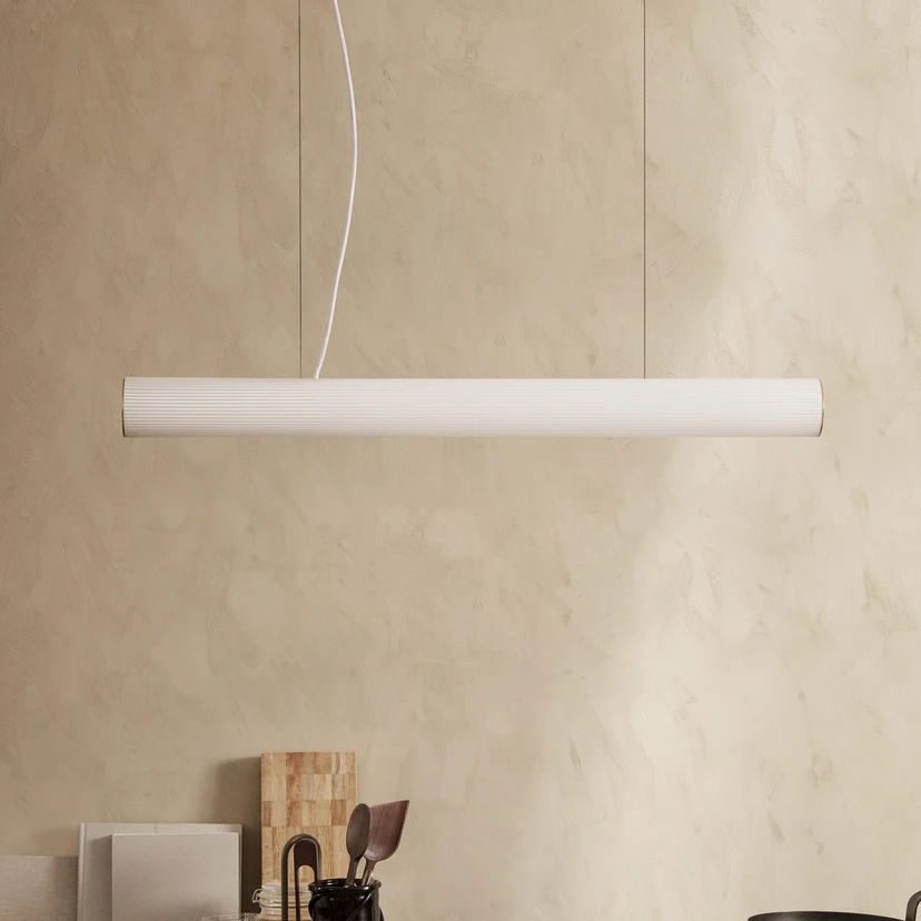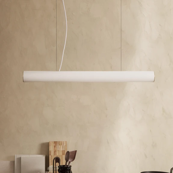 Remote control included: Vuelta 100 dimmable LED pendant light made of ribbed glass, 3,000 K, Ra90 The Vuelta 100 LED pendant light combines a complex texture with modern simplicity. It consists of a cylindrical, translucent lampshade made of glass with a pronounced fluting and features brushed brass details. Vuelta's LED light source emits a soft, diffuse warm white light with very good colour rendering (CRI>90) and the included remote control (CR2025 3V battery included) allows the luminous intensity to be dimmable, so that the desired atmosphere can always be created. With Vuelta, you get an elegant designer light in your home, which is also ideal for use in the catering or hotel industry.