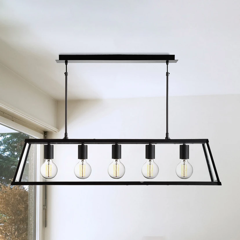 The Voyager hanging light has a total of five E27 light bulbs equidistant from each other on a beam that is attached to the canopy with the help of two suspension systems. Just as with a lantern, the light bulbs are framed by a metal construction with glass panels in it so that they are completely visible but not completely unprotected.