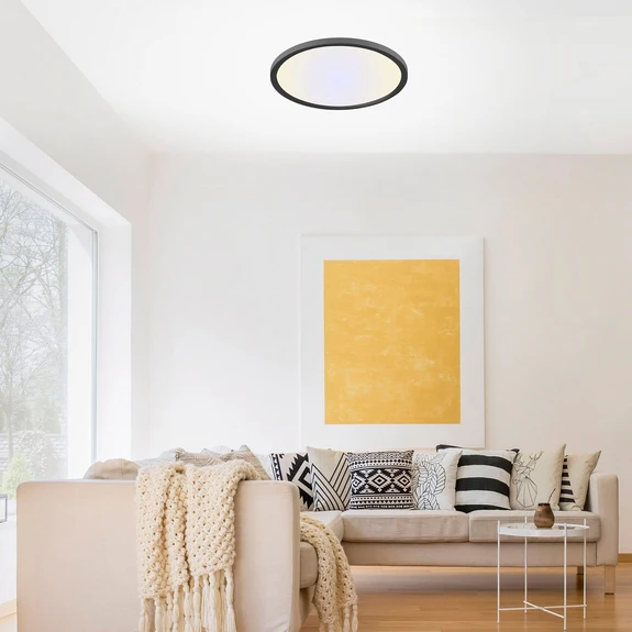 Round and flat design, this LED ceiling light Flat makes even rooms with low ceilings bright and inviting without dazzling, which is possible thanks to the plastic diffuser. Its homogeneous light distribution bathes any room in a pleasant light, which can also be conveniently controlled via a remote control, which is included. Via the remote control, the light color can be adjusted to the current situation and in combination with the dimmability, a typical daily routine can be simulated. The brightness can be adjusted as desired and thanks to the memory function, the individual settings can be saved directly.