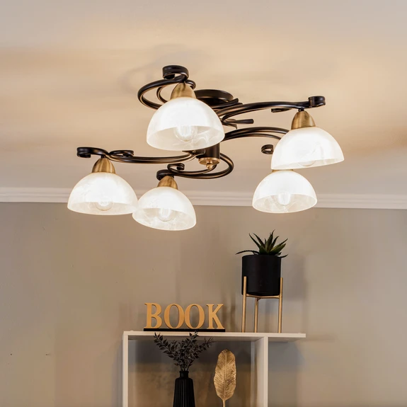 The Flora ceiling lamp combines rustic charm with timeless elegance, making it an eye-catching feature in any living space. Made from high-quality glass and sturdy steel, the lamp presents itself in a harmonious combination of satin black and elegant brass. The five artistically designed glass shades ensure even and pleasant light distribution, making it ideal for living rooms, hallways and dining rooms.