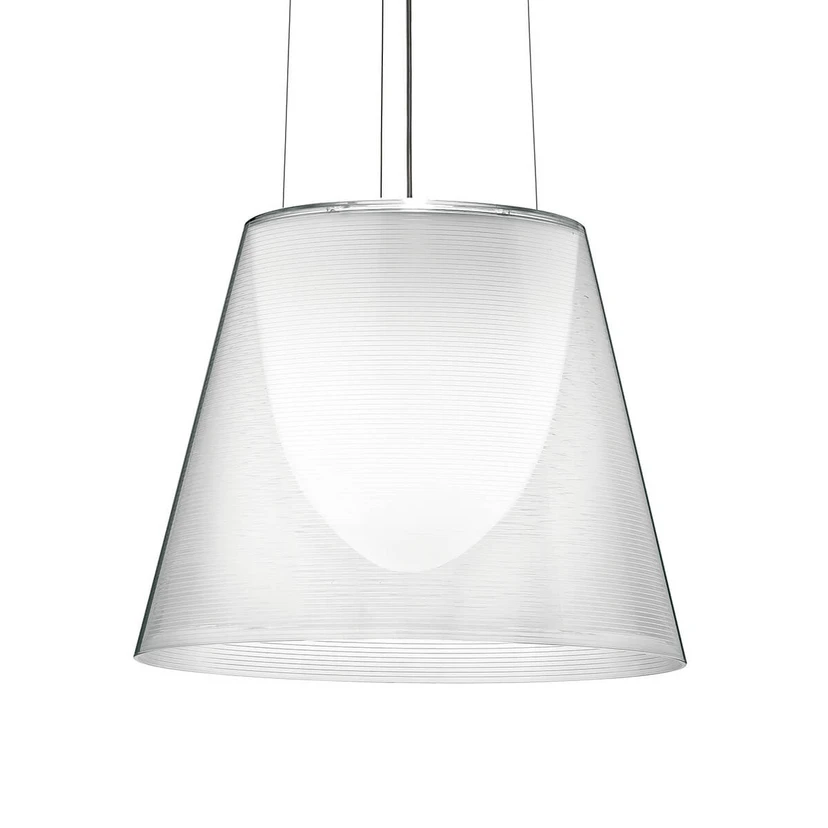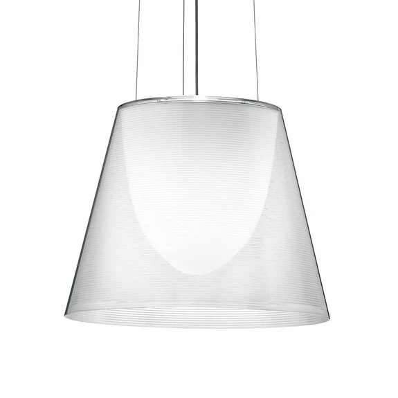 KTRIBE S1 pendant light from FLOS with elegant lighting effect thanks to translucent lampshade KTRIBE S1 is a pendant light designed by Philippe Starck that impresses with its extremely modern appearance and sets special standards in terms of design. The outer shape of the lampshade is classic, although PMMA is a very modern material. However, the use of a second, internal lampshade can be described as innovative. This is made of translucent, white polycarbonate and has a rounded shape. However, this is only partially visible, as the outer lampshade has a silver aluminium coating and is only really translucent in the upper part. This means that the light escapes mainly downwards and contributes to an atmospheric ambience - of course not without enhancing the room as a whole with the modern presence of the designer pendant light. The FLOS company has now been in existence for over 50 years and, with a team of renowned designers, creates special, high-quality lights that are widely recognised internationally and have received numerous awards.