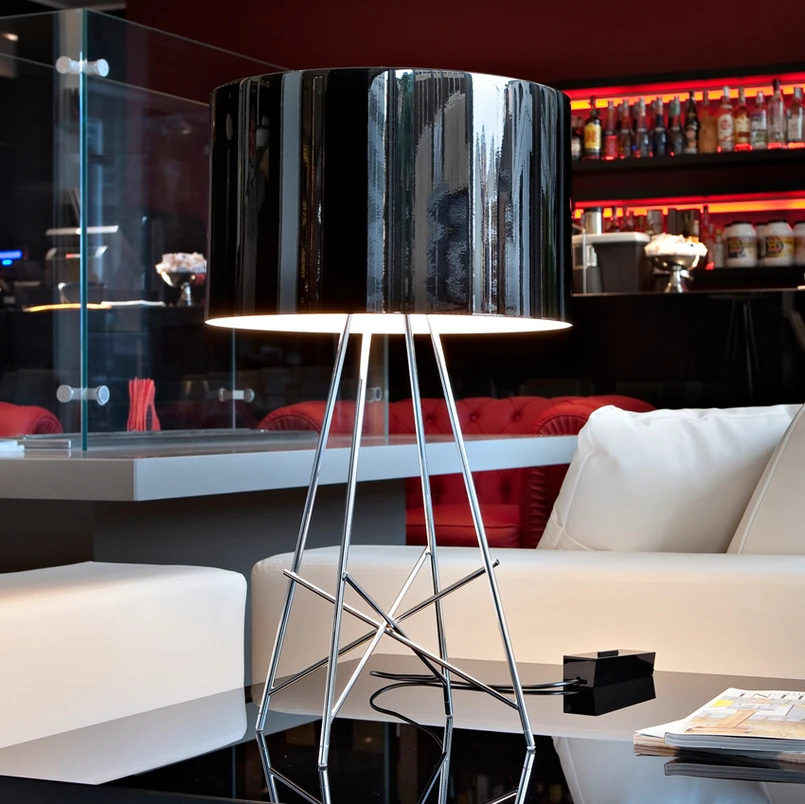 Interesting frame for the Ray T table lamp by Rodolfo Dordoni "The frame that supports the light source is an elementary structure; part lighthouse, part electricity pylon," says designer Rodolfo Dordoni about his creation, the Ray T table lamp. Four slender steel legs were not enough - they were "reinforced" by four cross struts. On top sits a rather classically designed lampshade in the typical cylindrical shape. With the help of the integrated dimmer, the brightness can be adjusted as required. Rodolfo Dordoni designed the Ray T table lamp for FLOS, the Italian lighting manufacturer known worldwide for its high-quality and aesthetically particularly attractive lights.