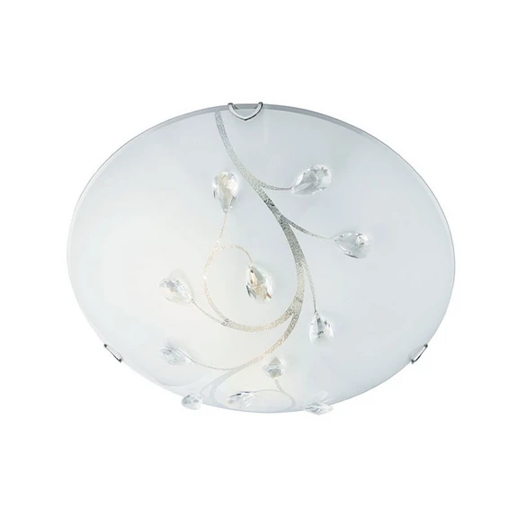 The ceiling lamp Flush Flower consists of a frosted frosted glass in white, which has a decorative floral design on the top. This is ideally complemented by small crystal leaf decorations, which give the otherwise so simple glass ceiling lamp Flush Flower that certain something. Whether during the day or in the evening when the light is switched on, the lamp always looks good and is especially convincing on plain white ceilings. It can be used in many different ways and cleverly embellishes the most diverse living spaces, whether living room, corridor or even bedroom.