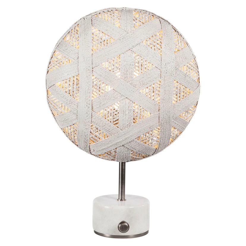 The circular shade of the Chanpen table lamp resembles a full moon, thus living up to its name, which means full moon. The table lamp provides cosy and glare-free light, mainly due to its shade covered with hemp fibres. The pattern formed by the hemp fibres consists of hexagonal shapes. At the foot of the lamp there is a rotary dimmer, which allows comfortable regulation of the brightness.