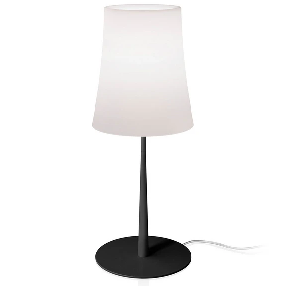 The Birdie Easy Grande table lamp is a new version in the Birdie series and created by designers Ludovica and Roberto Palomba. The concept is characterized by the uninterrupted straight rod. Furthermore, the large table lamp has a translucent, slightly outwardly protruding shade made of pointed cast polycarbonate and a round base made of a die-cast zinc alloy. On the cable is a toggle switch for conveniently switching the lamp on and off.