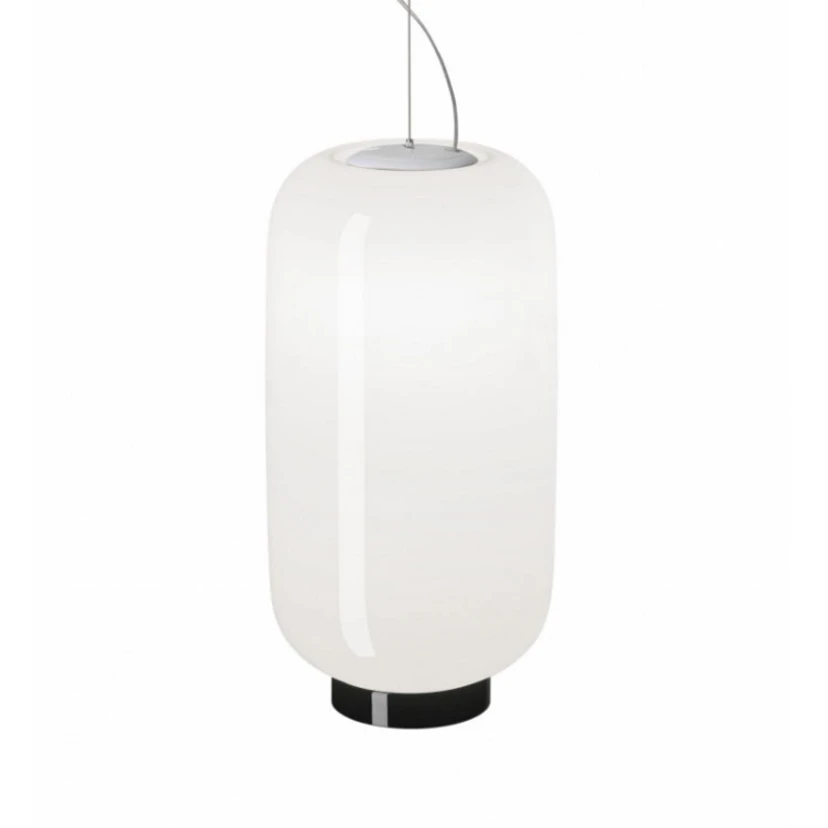Foscarini LED pendant light Chouchin Reverse 2, opal glass shade with black ring The blown glass shade of the Chouchin Reverse 2 LED pendant light has a cylindrical, round shape with a decorative black ring at the bottom. The series of lights was created by French designer Ionna Vautrin for the Italian manufacturer Foscarini and is reminiscent of traditional Japanese lanterns in its shape and design. These paper and bamboo lanterns, which are typically hung outside restaurants as illuminated signs or in front of houses for good luck, were the inspiration for Ionna Vautrin to design the Chouchin luminaire series, which consists of several different forms. The reverse version, in which only the decorative Ring is painted in colour and the rest of the lampshade is made of opal white Glas, provides diffuse light all around and direct lighting downwards. The aim of French designer Ionna Vautrin is to create objects that are immediately understandable yet surprising, combining industrial and poetic elements. The Chouchin pendant light is extremely versatile and can be used in private living spaces as well as in restaurants, cafés or hotel lobbies. The combination of different forms and colours in particular lends the room a special charm.