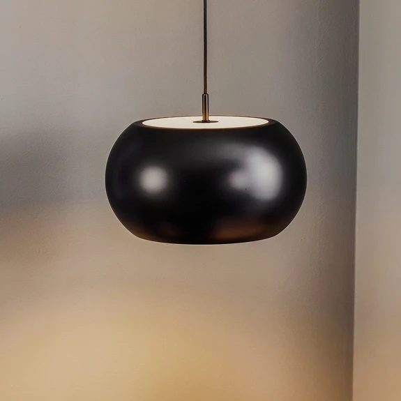 BF20 designer pendant light: direct and indirect light The BF20 pendant light is part of the successful lighting series of the same name by Benny Frandsen, an electrical engineer and founder of the Frandsen lighting company in Skanderborg (Denmark), which has been in existence since 1968. Die series includes pendant lights in various colours and sizes as well as single and 2-bulb floor and table lamps. They are all characterised by their minimalist design, which has a great effect on the viewer and blends harmoniously into a wide variety of living styles. BF20 is equipped with a round lampshade, which emits the light from the bulbs mainly downwards and thus adequately illuminates a table, for example. An acrylic disc is embedded in the top of the metal shade so that some of the light also shines indirectly upwards into the room. The canopy, like the lampshade, is made of painted metal and the suspension system consists of a black textile-coated cable. The inside of the lampshade is painted white for optimum light reflection.