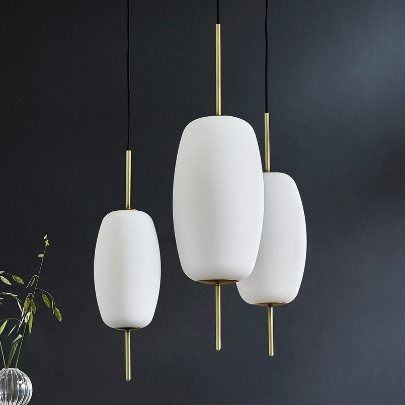 Silk designer pendant light with organically shaped glass shade The name for the Silk range of lights is derived from the design, which appears to be borrowed from Nature. The look of the lampshade evokes associations with the Kokon of a silkworm. The organic form of the white glass shade creates a fascinating contrast to the linear and elegant brass suspension. The Silk pendant light is an eye-catcher as a stand-alone piece and creates a pleasant lighting atmosphere all round, e.g. as a light source above a table. When hung in a group and at different heights, the decorative effect, which is already visible when unlit, is further enhanced. The design for the Silk pendant light comes from the manufacturing company Frandsen, which has been based in Skanderborg, Denmark, since 1972. Benny Frandsen, the founder of Frandsen, is an electrical engineer by training with a passion for the development and production of high-quality design products. Traditional craftsmanship is used and the focus is on high functionality.