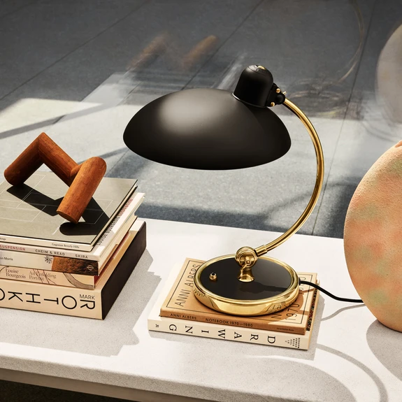 Designer table lamp Kaiser idell™ Luxus with matt coloured lacquer and elegant brass frame This table lamp, whose exquisite Bauhaus design dates back to 1936 by Christian Dell, is not only a comfortable light source for many occasions, but also works as a furnishing accessory for an upscale living style when switched off. Kaiser idell™ Luxus is part of the legendary Kaiser idell™ lighting series, which began in 1931 and includes various table lamps, wall lamps, floor lamps and pendant lights. The table lamp is fitted with an asymmetrical lampshade made of metal with a matt coloured lacquer finish, which sits enthroned on an elegant brass frame. The designer Christian Dell (1893-1974), the creator of Kaiser Idell™, was a master of his trade. He initially trained as a silversmith, then studied at the Saxon School of Arts and Crafts and in 1922 became master craftsman of the metal workshop at the Bauhaus in WEIMAR. In 1926, he moved to Frankfurt and took over the management of the art school there. His designs were always innovative and forward-looking. The Kaiser idell™ luminaire series (created in 1931) - including the Kaiser idell™ Luxus table lamp launched in 1936 - is produced by FRITZ HANSEN, the Danish lighting company that has been in existence since 1872 and is known beyond the borders of Denmark for its high-quality design products on the furniture and lighting market.