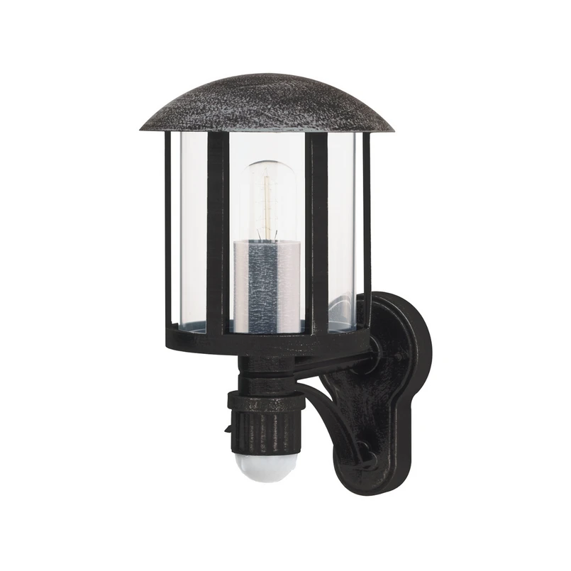 Practical Genefe outdoor wall light in the shape of a lantern with motion detector The Genefe outdoor wall light is reminiscent of a wrought-iron wall lantern. It creates an attractive Akzent on the house facade. Das is not least due to the colour design of this cast aluminium light. It is either black with a delicate silver finish or brown in colour with a brass finish. The keyhole-shaped wall mount has an arm at a horizontal 90° angle. This supports the lantern head on its base. The lantern housing is characterised by transparent acrylic glass panes. They emit light unhindered and provide a bright lighting effect. A beautifully shaped lamp for the E27 bulb socket can enhance the visual effect. GENEFE adds a rustic ambience to house entrances or patios and offers increased safety thanks to motion detectors. The optimum mounting height is 2.5 metres. The sensor lens can be adjusted in different ways and detects a range of 4 m, 8 m or 12 m, depending on the setting. The motion detector has the following additional technical features: Adjustment range: 330° Detection range: 120° Sneak-by guard: present Switch-on time (via potentiometer): 5 seconds to 20 minutes Brightness regulation (via potentiometer): 2 to 1,000 lux