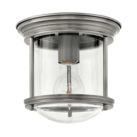 Hadrian Mini ceiling light for outdoor use The Hadrian Mini ceiling light is a classic light that suits almost any style. It consists of a steel frame with an antique finish, in which a one-piece glass lampshade sits. The bulb emits its light in all directions and downwards through this shade, providing wide-angle lighting for the entrance area or covered terrace.