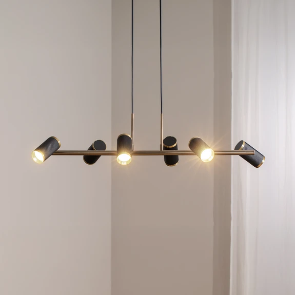 Lumens pendant light in black and antique gold with six adjustable spots Functionally convincing and designed in a trendy colour combination of black and antique gold, the Lumens pendant light enriches living rooms and lounges. Six spots are attached to the side of a horizontal bar, which can be aimed at the desired area.