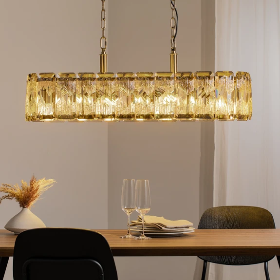 Orvin pendant light in antique brass with glass elements and 16 sockets The Orvin pendant light is an elegant furnishing element with an appealing lighting effect. There are 16 sockets inside the oval metal body in an antique brass finish. The light from the bulbs to be used falls through rectangular glass elements on the outside and is refracted. There is also a suspension with two chains and an oval canopy.
