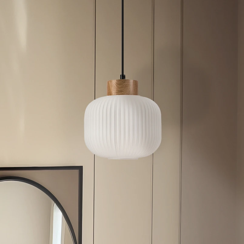 Harmony pendant light with oak wood and round opal glass lampshade