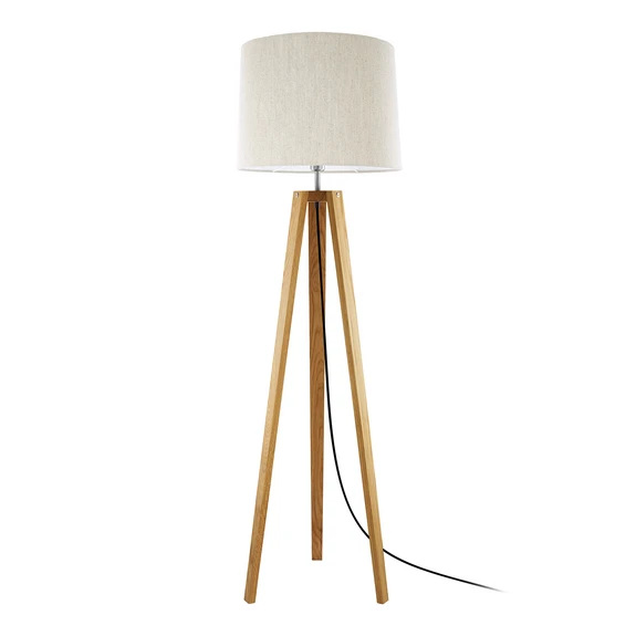 Floor lamp Anni with tripod of wood and fabric shadeHomely, naturally and versatilely combinable presents the floor lamp Anni. The timeless textile shade in the shape of a truncated cone emits the light of the lamp to be used through the vertical openings as well as gently all around through the fabric. The shade is supported by a high tripod frame made of solid wood. In addition, there is a socket as well as screw fittings made of matt brushed nickel- sustainably acquired wood from FSC-certified upstream suppliers- manufactured in Germany