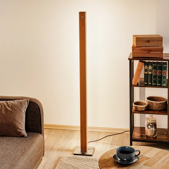 Angular LED floor lamp Leonora with dimmable function The high-quality LED floor lamp Leonora from the HerzBlut brand can be easily integrated into existing interiors thanks to its understated design. The modern light source consists of a long lampshade made of solid wood, which stands on a metal base with a matt brushed nickel finish. Energy-saving LEDs are lined up on one side of the narrow Saul. Particularly cosy lighting is achieved by positioning the light element towards the wall. Leonora can be controlled directly via buttons attached to the light. The footswitch is for switching on and off and the touch dimmer can be used to adjust the lighting as required. The integrated dimmable-to-warm technology enables the brightness and light colour (2,200-4,000K) to be continuously adjusted. The lower the intensity, the warmer the light shines into the room. The high CRI value (>90) also ensures that colours are displayed as unadulterated as possible. HerzBlut's contributions to environmental protection - CO²-neutral energy supply for company locations and production - Made in Germany - Regional suppliers - Product certification for wood according to FSC - Environmentally friendly packaging - Advertising materials made exclusively from Natur materials - Lights are made from natural and renewable raw materials - The LEDs can be replaced by the manufacturer - Light parts are 100% recyclable - In-house repair workshop