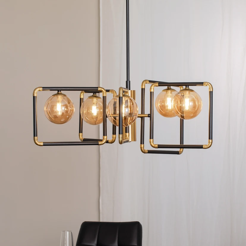 The Ibra pendant light combines modern design with high-quality materials and offers impressive lighting effects. Made from robust steel and elegant glass, the light fits seamlessly into contemporary living concepts. The combination of black, gold and amber glass creates a fascinating play of light and shadow that bathes every room in a stylish atmosphere.