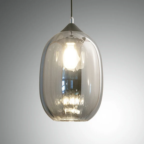 Infinity pendant light - harmoniously curved smoked glass lampshade The 1-bulb Infinity pendant light impresses with an elegant, blown glass shade in a smoky grey tint, whose convex shape tapers to the upper and lower ends. A downward-facing E27 bulb can be fitted with a matt bulb for functional lighting, while the choice of a filament bulb emphasises the decorative touch of the smoked glass. As a solitaire or in groups, Infinity can be perfectly integrated into many modern living rooms and lounges - Suspension height adjustable during installation