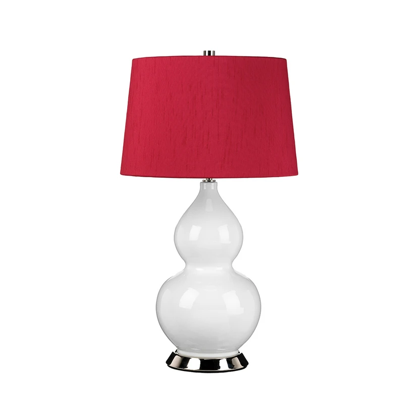 Isla table lamp - the ideal complement to a classic style of living This pretty table lamp attracts the eye even when it is still unlit. The shade of Isla is made of fabric, it is enthroned on a bulbously shaped white ceramic frame. A base made of steel with a polished nickel finish completes the successful look. Isla provides soft additional lighting for living rooms and bedrooms. The on/off switch is located on the cable.