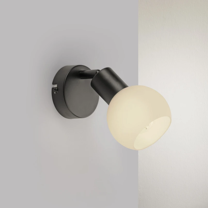 Loki wall light made of iron and glass with E14 LED bulb The Loki wall light with a frame made of black lacquered iron and an almost spherical lampshade made of glass is an all-rounder for many areas. The head of the light can be adjusted. The wall light with an almost spherical, satinised lampshade is supplied with an LED bulb with an E14 base and warm white light colour.