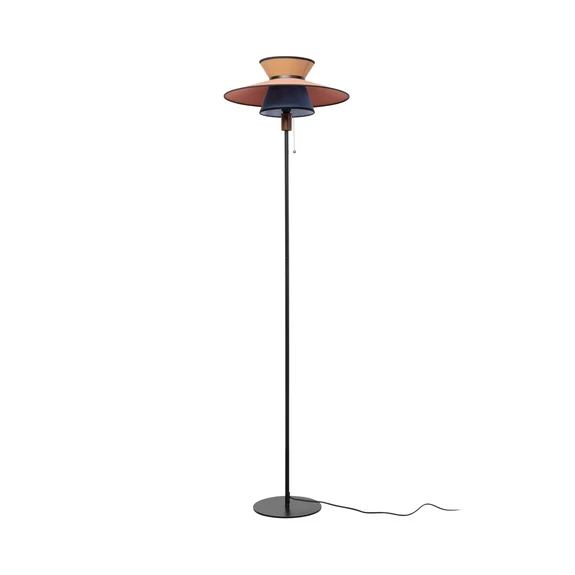 Riva floor lamp with fabric shade in a variety of colours The round Riva floor lamp is an impressive source of characterful and cosy light. A black steel frame supports the lampshade, which is divided into three differently shaped truncated cone elements made of cotton textile. These are available in brown, rose and blue. The Riva floor lamp is rounded off by a cylindrical element made of rubberwood underneath the lampshade. Equipped with pull switch.