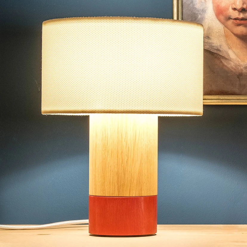 HELL table lamp Klippa with dimmer The wide cylindrical lampshade is made of newly developed Trooper fabric, which sets an Akzent with its clear structure. Its alabaster white colouring gives Klippa a bright character. The cylindrical shape is continued in a narrower form in the base in natural oak and the coral-red base. The cable is equipped with a practical manual dimmer.