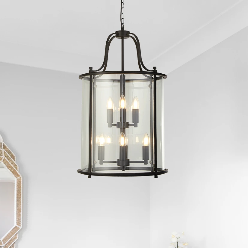 Lantern Grande pendant light, black/clear, glass, E14