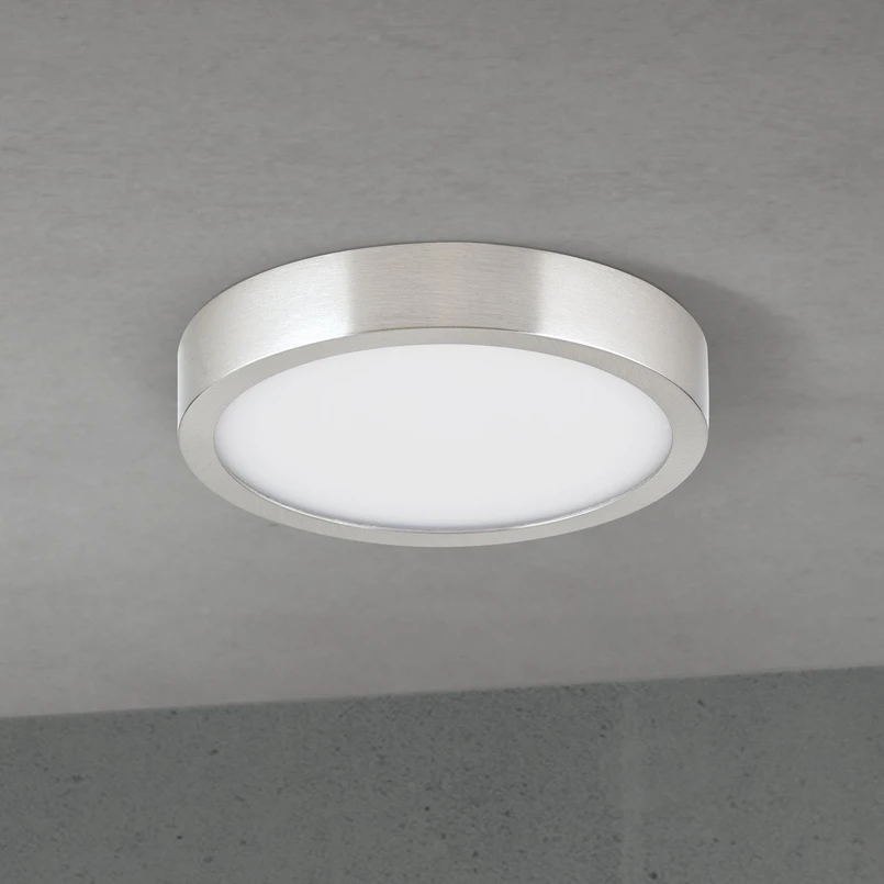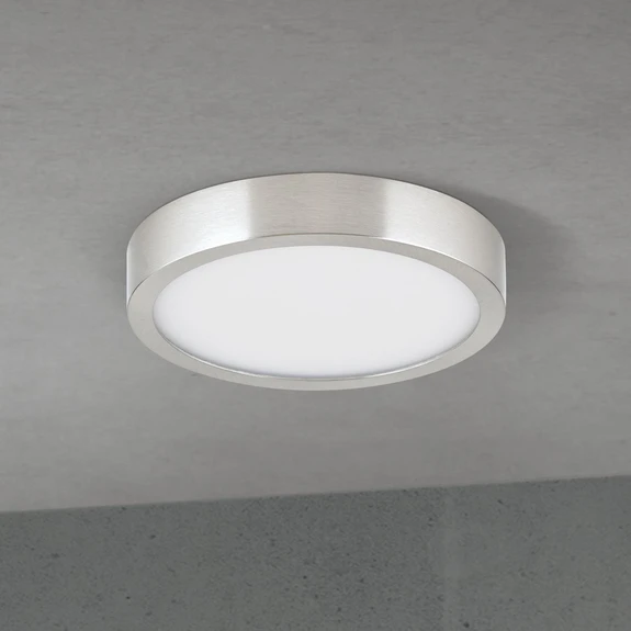 The Disc LED ceiling lamp combines modern design with versatile functionality. Made of aluminium and plastic, it blends harmoniously into contemporary living concepts. The nickel-coloured, satin finish gives the lamp an elegant look that adds stylish accents to living rooms, dining rooms, kitchens and hallways.