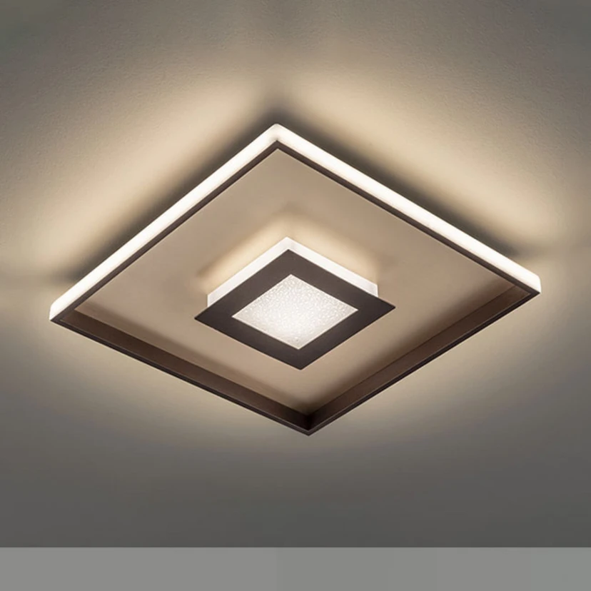 LED ceiling lamp Bug, square in rust and gold with remote control The flat LED ceiling light Bug, which has a square shape and is made of metal with a matt gold finish and a rust-coloured trim, is pretty to look at. The light is fitted with warm white LEDs both at the edge and in the centre. The light is also partially indirect and creates a beautiful lighting effect on the ceiling. The light is supplied with a remote control that can be used to switch the light on and off conveniently and is also infinitely dimmable.
