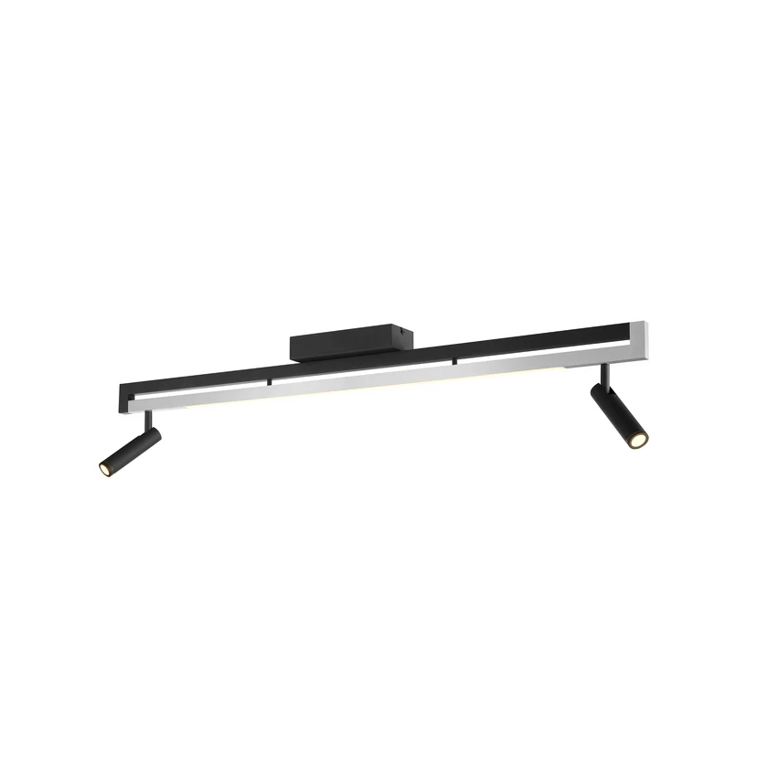 The Pulse LED ceiling spotlight in elegant black and chrome combines modern design with functional lighting. This ceiling light is equipped with two movable spotlights and a light outlet along the entire length of the ceiling beam, ensuring adequate ambient lighting.