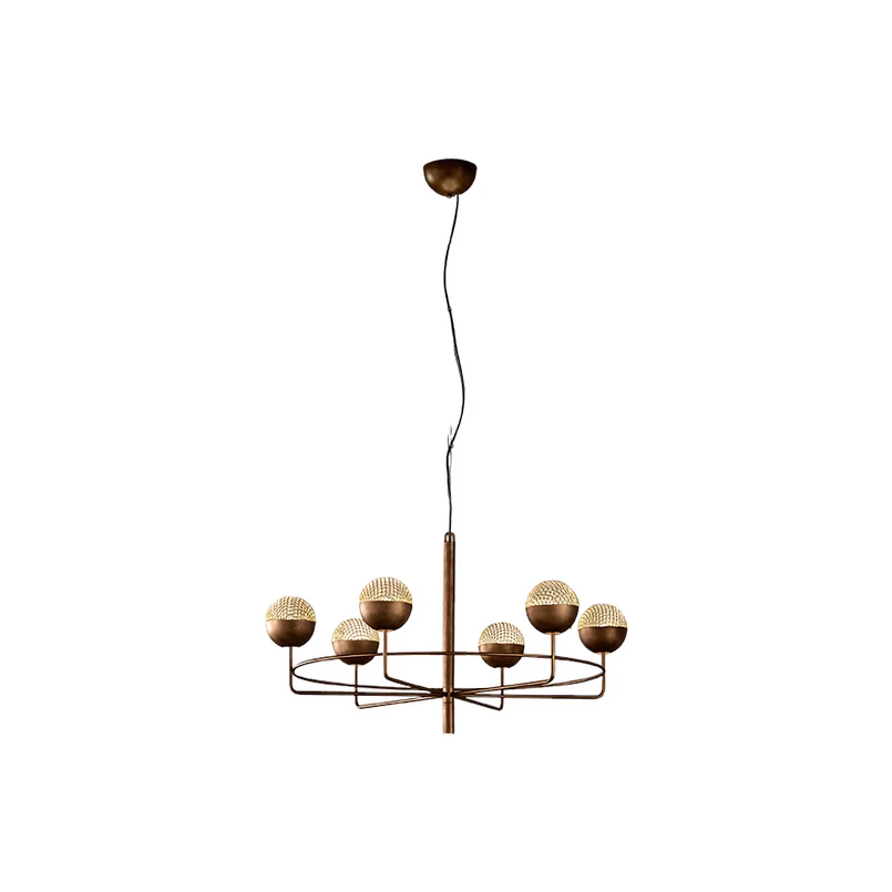 Made in Italy: Iglù Round 7-bulb LED chandelier, 3,000 K, CRI>95 The Iglù Round 7-bulb LED chandelier is the perfect choice for anyone looking for a stylish and high-quality lighting solution. With its integrated, warm white LED light sources, it creates a pleasant atmosphere in the living room. This designer light also scores points with its particularly good colour rendering (CRI>95). Iglù presents itself with its six lampshades in a spherical shape. While the lower halves of the lampshades are almost completely closed and have a patinated brass look to match the frame, the upper hemispheres with a gold-lacquered mesh structure create an enchanting interplay of light and shadow. In addition, a spot on the underside of the centre tube creates direct downward lighting. This LED chandelier is manufactured by the lighting manufacturer Masiero in Italy and impresses with its modern design that blends seamlessly into any style. Iglù was designed by award-winning designer Oriano Favaretto.