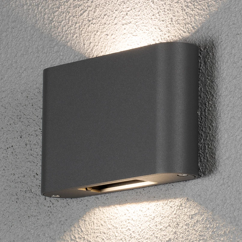 Effective outdoor wall lighting with the Chieri LED wall light Upward and downward light outlets, each individually adjustable at an angle of 0 to 90 degrees for effective lighting on the outdoor wall - this is how the Chieri LED outdoor wall light presents itself. Its oval form and simple aluminium design allow Chieri to harmonise perfectly with various styles. The two high-power LEDs emit warm white light into the surroundings through clear glass diffusers.