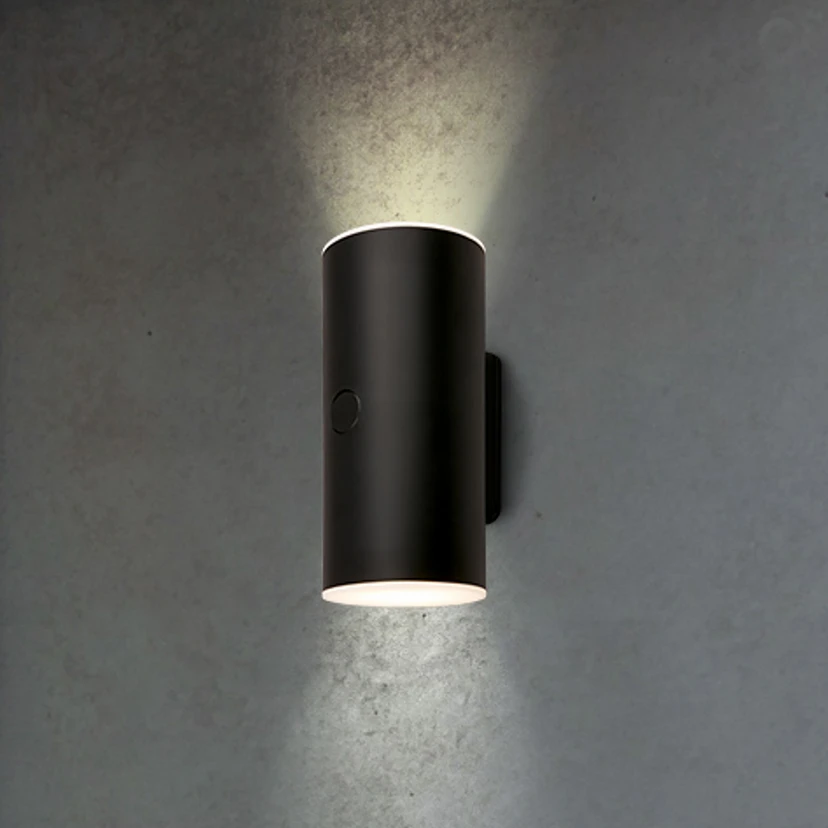 Cylindrical LED outdoor wall lamp with rechargeable battery and touch dimmer - up and down distribution This LED outdoor wall light made of plastic in a cylindrical shape is a particularly practical up-and-down light source for outdoor areas. It is equipped with a rechargeable battery, so there is no need for a fixed power connection. Switching takes place directly on the light; after switching on, the light is active for 15 minutes until a timer switches it off automatically. There is also a touch dimmer that allows the selection of three brightness levels - IP code: IP44 - USB-C charging cable included - Can be removed from the wall mount for charging in dry indoor areas - Brightness levels: 100 % / 50 % / 15 % - Charging time 8.5 h, lighting time 20 h (at 15 % light output)