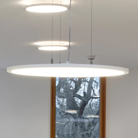 The FL Round 777 PL OP LED pendant luminaire can be used to achieve large-area, pleasant general lighting in modernly furnished office and commercial spaces. The flat, round design and white, scratch-resistant powder coating of the die-cast aluminium housing has a neutral visual effect. The characteristic, homogeneous and wide light output is provided by the lateral light feed (LED sidelight technology) the highly-transmitting light guide and the opal plastic cover.