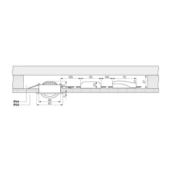 The Dione LED recessed ceiling spotlight impresses with its particularly low installation depth. This makes it very space-saving and requires only a ceiling cavity of 25 mm. The compact design of the included connection box and dimmable power supply unit also fits into the 68 mm cut-out. Since all components are pre-assembled for operation, a time-saving tool-free installation is possible. The connection box with plug-in terminals also enables 3-pole through wiring. This makes the recessed light the ideal solution for retrofitting during a renovation or for new installations where there is little installation space.
