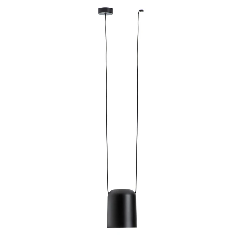 The single-flame Attic pendant luminaire is designed as a simple, modern, adaptable light source. The cylindrical aluminium shade is open at the bottom and provides direct lighting, for example above a table. The black suspension is composed of a canopy, another ceiling attachment and a cable running in between. The latter runs through the shade, so that its suspension height can be adjusted by setting the distance between the two mounting points during installation.