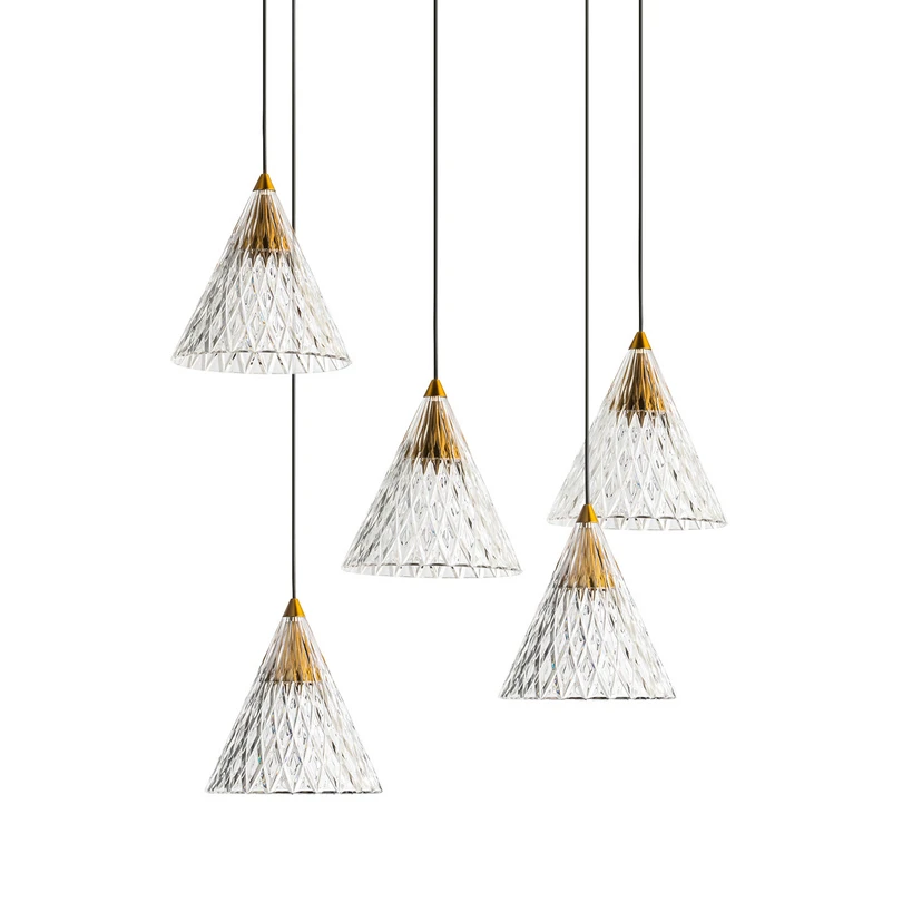 Veneto is a five-lamp LED pendant luminaire with an elegant exterior and flexible positioning. Its pendants are composed of clear, textured acrylic cones with the look of classic crystal glass and metal elements in a brass finish. The latter house the warm-white LEDs, whose light is emitted directly downwards and reflected and refracted attractively at the sides. The long cables emerge from the side of the canopy and can be attached decentrally to the ceiling with additional attachment points, so that the position and height of the pendant can be ideally determined for the table or area to be illuminated.